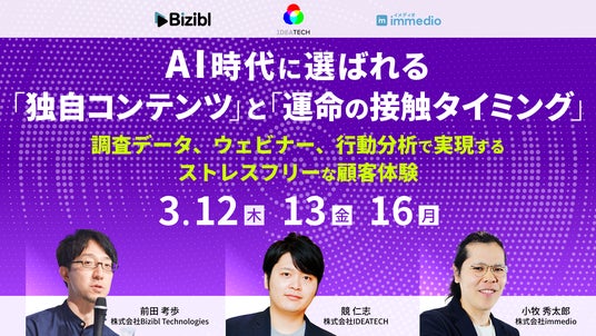 ウェビナーマーケティングツール「Bizibl(ビジブル)」を提供する株式会社Bizibl Technologies(本社:東京都千代田区、代表取締役:花谷 燿平、以下 Bizibl)は、AI時代に選ばれる「独自コンテンツ」と「運命の接触タイミング」をテーマとしたウェビナー「AI時代に選ばれる『独自コンテンツ』と『運命の接触タイミング』~ 調査データ・ウェビナー・行動分析で実現する、ストレスフリーな顧客体験」を、2026年3月12日(木)から3月16日(月)までの期間、Bizibl上にて開催いたします。