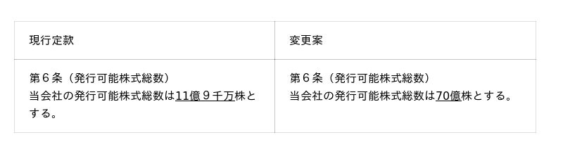 今回の株式分割に伴い、会社法第184条第2項の規定に基づき、当社定款第6条の発行可能株式総数を変更します。