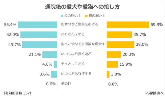 犬の場合:「おやつやご褒美をあげる」(55.4%)が最多。「たくさんほめる」「抱っこやなでる回数を増やす」も50%前後と横並び、通院後は三拍子そろった全力ねぎらいタイムに。
