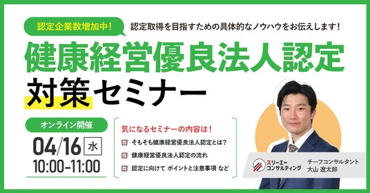 ISO・Pマーク支援実績数全国No.1※のISO/Pマークの取得・運用支援サービス「認証パートナー」を提供する株式会社スリーエーコンサルティング(本社:大阪府大阪市、代表取締役社長:竹嶋 寛人)は、4/16(水)10:00-11:00「健康経営優良法人認定対策無料オンラインセミナー」を開催します。「健康経営優良法人ってなに?」「認定取得の流れ、やるべきことが分からない…」という方へ向け、取得のメリットや取得の流れ、ポイントと注意事項などを健康経営のプロが分かりやすく解説いたします。