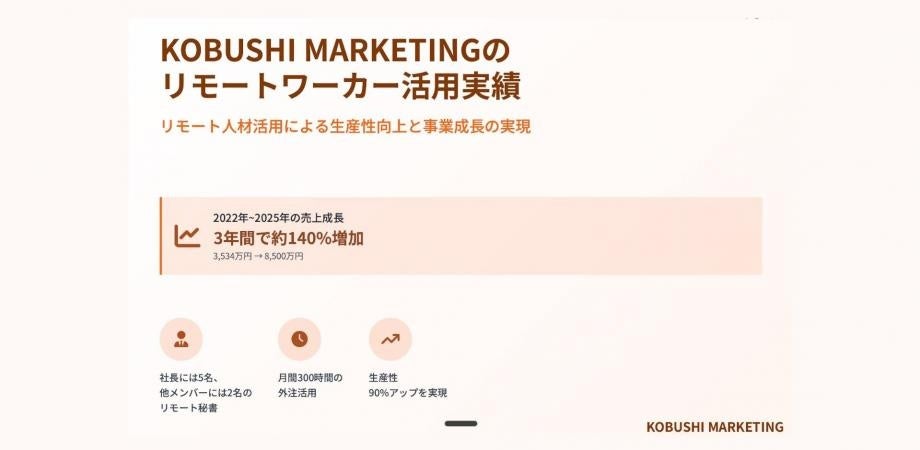 KOBUSHI MARKETING合同会社(東京都渋谷区、代表:井上裕介)は、ビジネスの拡大に繋がる様々な取り組みを行っている。そして今回、代表の井上が自らスピーカーを務め、2025年12月2日(火)20:00~リモートワーカーの活用実績について紹介するオンラインセミナーを開催すると発表した。