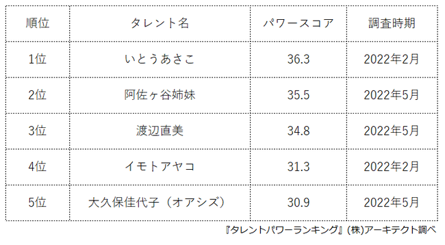 本ランキングは、2022年5月度に実施したタレント調査データ(一部過去実施データ)を利用し、タイトルに応じてランキング形式でまとめたものです。