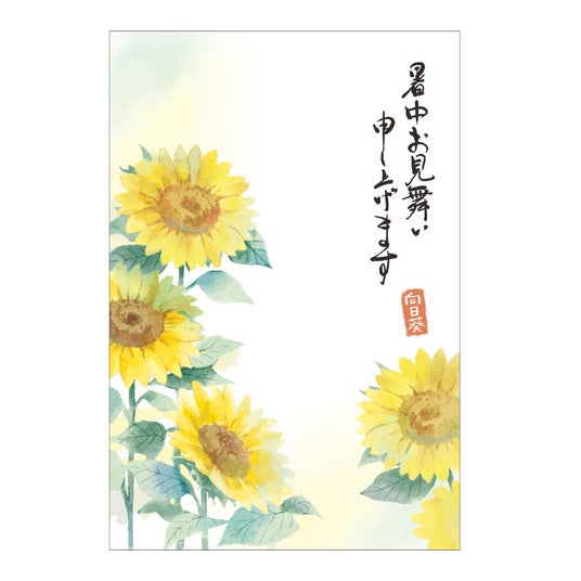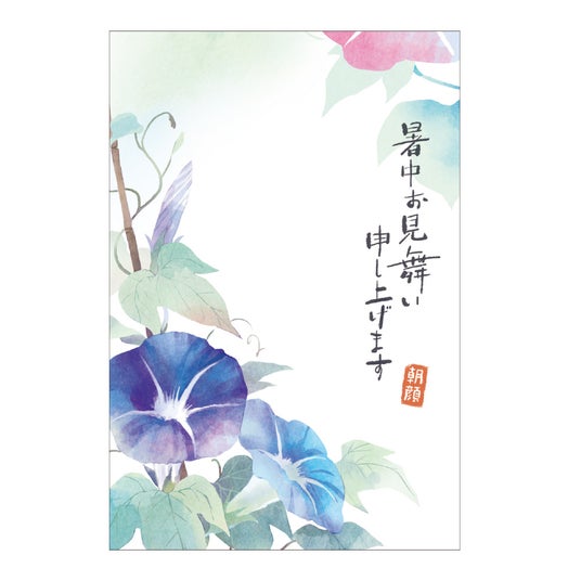 風鈴の音色、朝顔やひまわり、そしてうちわに金魚--夏の風物詩をちりばめたデザインに、あらかじめご挨拶文が入った便利なデザインです。暑中見舞いや残暑見舞いの季節に、手軽に、そして丁寧に気持ちを伝えたい方におすすめです。手書きのひと言を添えるだけで、季節のぬくもりと心遣いが届きます。