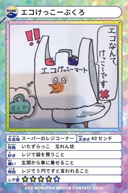 本コンテストは、くらしの中のCO2発生につながるムダ行動をモンスターとして描くことで脱炭素行動を自分ゴト化してもらうために実施したもので、県知事賞には、小学6年生の児童が考案した買い物時のムダなレジ袋購入を表現したモンスター「エコけっこーぶくろ」が選ばれました。また、審査で選ばれた作品の一部は児童による投票が行われ、最も多くの票を集めた小学4年生の作品「寝ズ見」が児童投票賞を受賞しました。