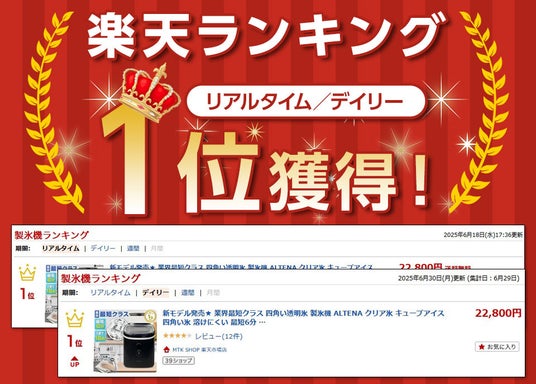ALTENA クリアキューブ 高速製氷機は、2025夏の新モデルにも関わらず、早くも『楽天リアルタイムランキング&デイリーランキング』で堂々の1位を獲得!