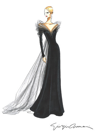 ジョルジオ・アルマーニはアデルの着用に際し、自身が描いたスケッチ画を公開。シェイプされたウエストラインから控えめに広がる裾のデザインが、見事にイラストで表現されています。