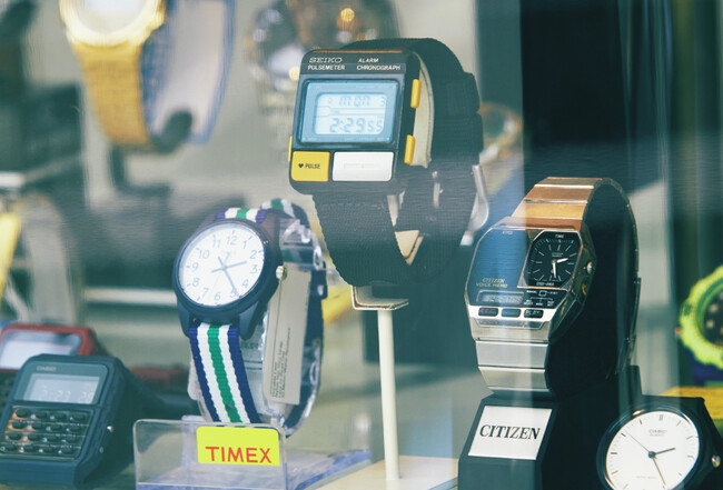 腕時計業界においてトレンドとなっているカテゴリは様々ありますが、セカンドとして2つの潮流に注目しました。ひとつはクラシックな金時計。コーディネイトに分かりやすくエレガントな印象を、さりげなくプラスしてくれる金時計は、できれば手に入れておきたいアイテムです。どんどん価格が高騰しつつある素材ですが、お手頃で手に入れやすい30万円以下のモデルのみを選出しました。その一方で、80~90年代ごろに一世を風靡した、レトロな顔つきの時計も気になります。たとえば神宮前にある「時計店エル」のようなお店で手に入る、リボンベルト付きの〈TIMEX〉(タイメックス)や、レトロフューチャー調のデザインが男心をくすぐる〈SEIKO〉(セイコー)の[パルスメーター]など。当時をリアルタイムで知る人には懐かしく、知らない人には新鮮に映る。そんなレトロウォッチも今また気になります。