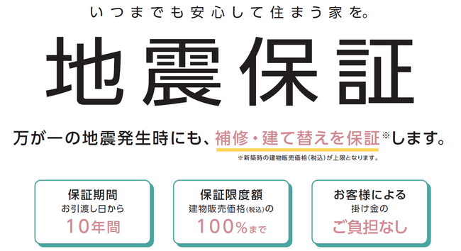 これまで当社が取り組んできた、耐震性の高いテクノスター工法、繰り返しの地震にも強いオリジナル制震システムEVAS(イーバス)、全棟耐震3設計、全棟耐震3チェック証明書、実物大建物での実験検証などの「命を守る構造体」と、地盤・構造20年長期保証、60年定期点検システム、第3者機関検査体制(3回)、200項目以上の自主検査体制といった「保証・検査体制による安全性の実証」に加え、新築から10年間、万が一お住まいが地震の揺れを起因として全壊・大規模半壊・中規模半壊・半壊してしまった場合でも補修・建て替え費用を建物販売価格(税込)の100%まで保証する「地震保証」を提供開始しています。これらをパッケージとしてお客様に提供します。