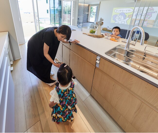 ・キッチン: オープンでフラットなキッチンで、子どものお手伝いしたいという希望を叶えます(4.)