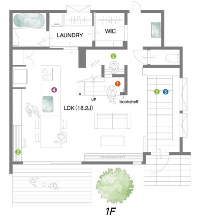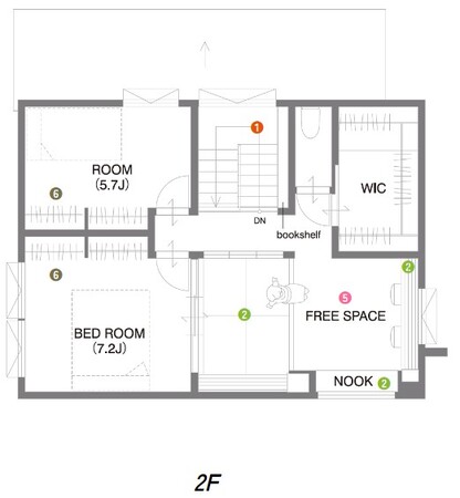 ・2階:将来的に個室にもできる、フリースペースを設置。小上がりタタミスペースは、寝室ともつながっており、子どもが小さい頃は、引き戸を開けて開放的に使ったり、子どもを寝かしつけた後に仕事ができるようになっています(2.)。窓際のヌックは、外を眺めながら読書やゲームのできる、居心地の良い空間です(2.)