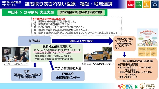 埼玉県戸田市と医療法人慈公会公平病院は、誰も取り残されない医療・福祉・地域連携を目指し、公平病院が運用する医療MaaS(ヘルスケアモビリティ)を活用したオンライン診療と連携し、地域の医療機関が社会的処方を実施できるような仕組みづくりを進めていくため、包括連携協定を締結します。