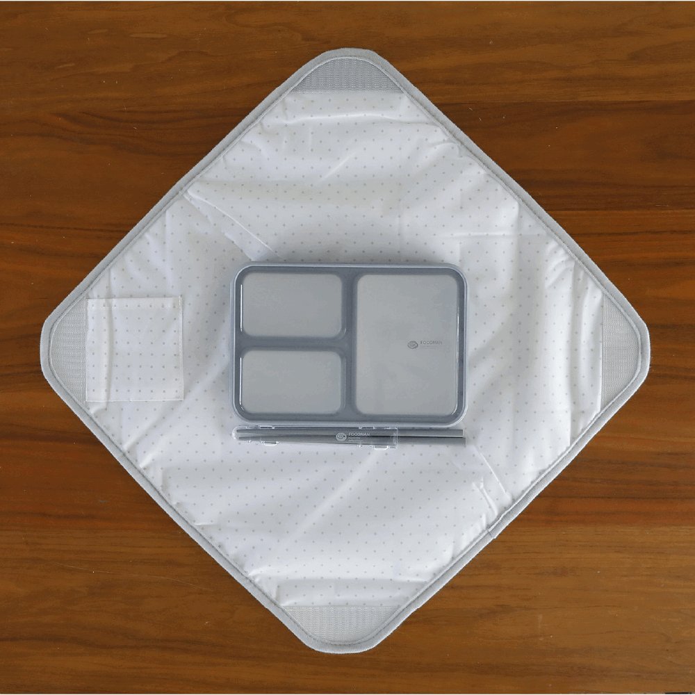 内側の4隅に面ファスナーが付いているので、弁当箱を中心に包み込めばどんな形の弁当箱もしっかり包めます。