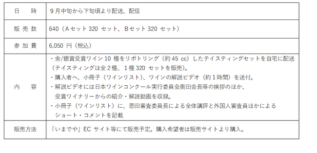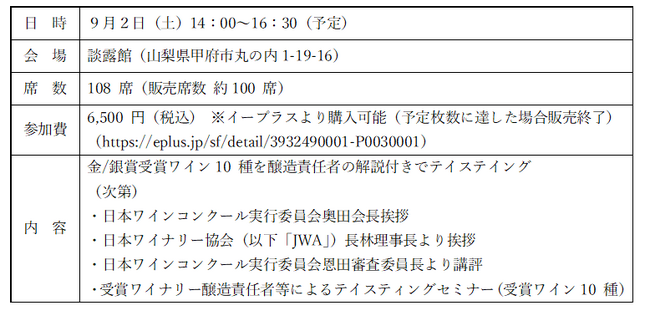このたび、次のとおり表彰式を行うとともに、金賞等受賞ワイナリー醸造責任者等の解説付き一般者向けテイスティングセミナー(以下、「一般消費者向けセミナー」)を併せて実施いたしますので、ぜひご参加ください。