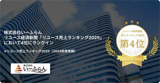 株式会社いーふらん(本社:神奈川県横浜市、代表取締役社長 鹿村大志、以下いーふらん)は、リユース業界専門紙『リユース経済新聞』が発表した「リユース売上ランキング2025」において、全国のリユース企業の中で第4位にランクインしましたことをお知らせいたします。