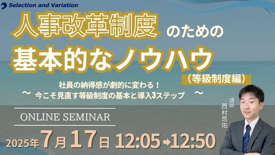 組織・人事コンサルティングファームであるセレクションアンドバリエーション株式会社(以下、当社、東京都千代田区丸の内、大阪市西区、名古屋市西区 / 代表取締役社長:平康慶浩/ URL:https://sele-vari.co.jp/ )は『人事制度改革のための基本的なノウハウ(等級制度編) ~社員の納得感が劇的に変わる!今こそ見直す等級制度の基本と導入3ステップ~』セミナーを2025年7月17日(木)12:05~12:50に開催することをお知らせいたします。