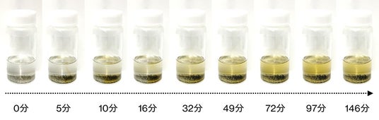 図2.poly(NiETT)粉末が水を25%含むテトラヒドロフラン溶液に自発的に分散する様子