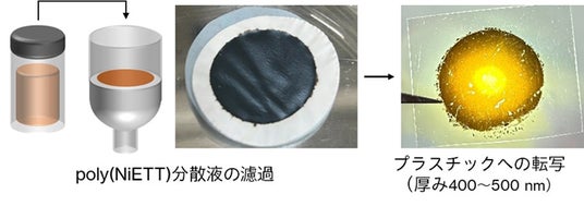 しかしながら、この有望な材料 poly(NiETT) は、粉末のままで溶けない=不溶性であると認識されており、実際にフィルム化したり樹脂と複合化して利用する際にこの不溶性が大きな障害となっていました。