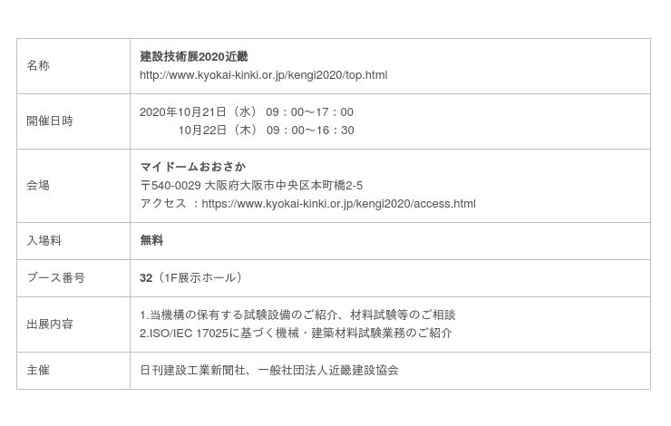 一般財団法人日本品質保証機構(本部:東京都千代田区、理事長:小林 憲明)は、2020年10月21日(水)~10月22日(木)にマイドームおおさか(大阪市中央区)で開催されます「建設技術展2020近畿」に出展いたします。