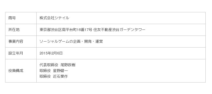 ゲームの企画・開発・運営事業を展開する株式会社Cygames(以下サイゲームス、本社:東京都渋谷区、代表取締役社長:渡邊耕一)は、ゲームの企画・開発・運営を行う株式会社シテイル(以下シテイル、本社:東京都渋谷区、代表取締役:尾野政樹)を2015年2月6日付で設立したことをお知らせいたします。