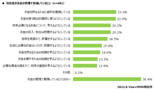 次に、予備調査から高校生481人を抽出し、お金の管理で意識していることについて聞いたところ(複数回答可)、「お金を貯めるために節約を意識している」が23.1%と最も多く、次いで「お金を使う時は計画的に使うようにしている」が22.9%、「将来必要となるお金について、考えるようにしている」が20.2%となった。
