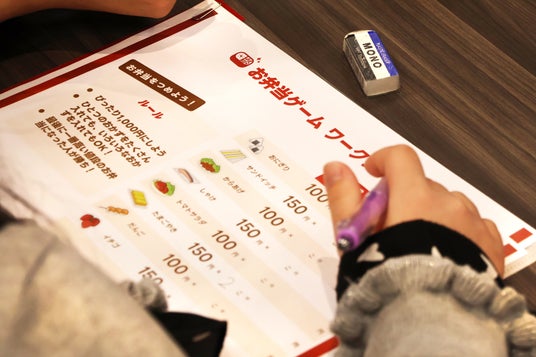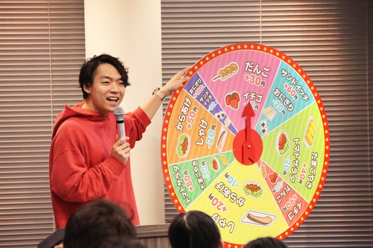 ランキングクイズに続いて、「お弁当ゲーム」が行われました。このゲームでは、子どもたちがお弁当屋さんになり、値段が決まっている8種類のおかずを組み合わせてちょうど1,000円になるお弁当を作ります。ルーレットによっておかずの値段が値下がりしたり値上がりしたりするという仕組みで、3回ルーレットを回したあとにお弁当の値段が一番高くなっていた人が優勝です。
