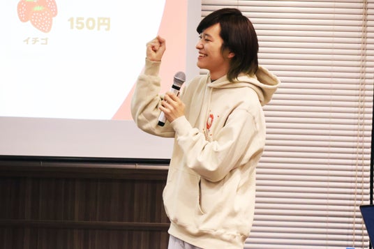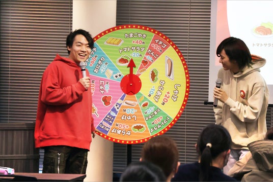 約5分間の話し合いが終わり、満を持してルーレットが回されると、子どもたちからは「サンドイッチ来い!」「い・ち・ご! い・ち・ご!」などの声があがり、会場は大盛りあがり。子どもたちと同じように自分のお弁当を作っていたとむも、ルーレットが回るごとにガッツポーズをしたり、頭を抱えたりしてしまいました。