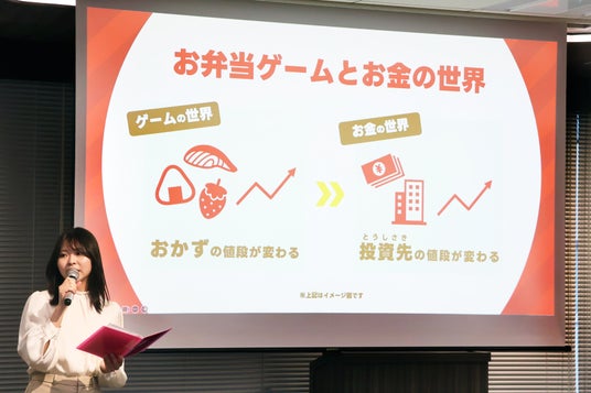 ゲームのあとは、解説のため野村アセットマネジメントCXソリューション部の五代紗英氏が登壇。お弁当ゲームでおかずの値段が変わったように、お金の世界でも値段が変動する株式を扱っていることを説明し、先ほどのゲームが実際の投資のイメージと結びついていることを伝えました。