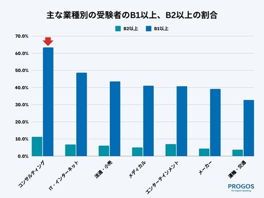 受験者数が特に多かった、IT・インターネット、コンサルティング、メーカー(メディカルを除く)、エンターテイメント、メディカル(医薬品、医療機器)、運輸・交通に絞り、分析を行ったところ、コンサルティング業界はB1以上が60%以上と、他の業種と比較して英語力が高いことが分かりました。