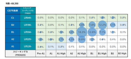 英語を学ぶビジネスパーソンの多くの方が受験しているTOEIC(R)L&Rと、「PROGOS(R)」の両方を受けた69,350人の受験データを活用し、技能間の比較分析を行いました。CEFRレベルを共通の尺度として比較したところ、リスニング力とリーディング力が「B2」以上の人でも相応のスピーキング力を持つ人は18%に過ぎないことが分かりました。また、「B1」レベルを持つ人で比較した場合は、47%でした。これにより、依然としてリスニング・リーディング力とスピーキング力の間には大きな差があり、英語を使ってビジネスができるか判断するには、スピーキング力も測定することが重要であることが分かりました。