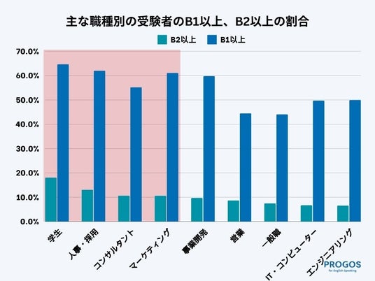 営業、一般職、事業開発、エンジニアリング、IT・コンピューター、人事・採用、マーケティングの職種に加え、学生を対象に分析を行いました。その結果、「B2」以上のレベルの割合が多い職種は、人事・採用、コンサルタント、マーケティングでした。さらに、学生の受験者はほか職種と比較しても「B1」以上「B2」以上共に最もスピーキング力が高いという結果となりました。