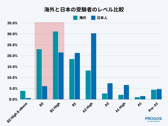 ・また、これに対し、海外受験者の最多レベルは「B1High」であり、「B2」以上が4分の1を超えていた