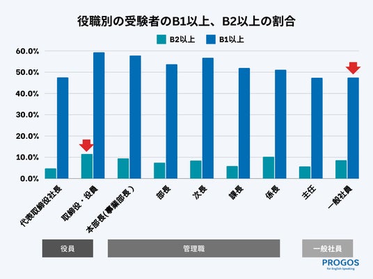 一般社員から代表取締役までの役職別の比較を行いました。すると、取締役が最も「B2」以上のレベルが多いことが分かりました。また、「B1」以上の割合が一般社員が47.9%と最も少なかったのに対し、管理職と役員は軒並み半数を超えました。