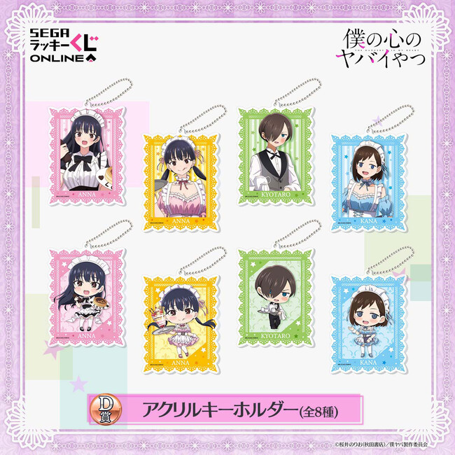 セガ ラッキーくじオンライン「僕の心のヤバイやつ」では、メイドと執事の描き下ろしイラストを用いたアイテムが当たります。「マルチクロス」や、「B2タペストリー」、「アクリルスタンド」、「アクリルキーホルダー」、「缶バッジ」など、多数のアイテムをご用意いたしました。