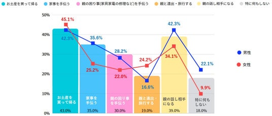 実家に帰省する際の行動としては、「お土産を買って帰る」と回答した人が43.0%と最も多く、約半数にのぼりました。続いて多かったのは「親の話し相手になる」で、全体の39.0%にのぼり、特に男性では42.3%と高く、普段はなかなか話す機会の少ない親とのコミュニケーションを重視している人が多いことがうかがえます。「何もしない」と回答した人は18.0%と少数派で、「家事を手伝う」や、実家の家具・家電の修理や庭掃除をするなどの「親が困っていることを手伝う」と回答した人は全体の約3割にのぼりました。これらの結果からお盆の帰省は単なる滞在にとどまらず、親のために何かをしたいという意識が伝わってきます。