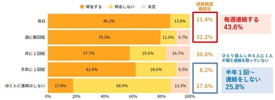 実家帰省派は3割弱。日常の家族との連絡頻度と帰省意向は比例することが判明。毎日連絡する人の86%が帰省予定に対して、ほとんど連絡しない人は18%