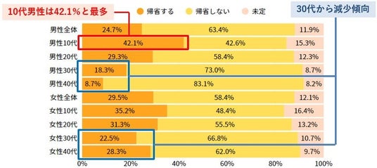 性別では女性の方がやや帰省する割合が高い傾向にありますが、性別と年代を掛け合わせて見ると10代男性が4割強と最も高い帰省意向を示しています。男女ともに、10代・20代の若年層で帰省意向が高く、30代以降では徐々に低下する傾向が見られます。特に女性では30代が最も帰省意向が低く、40代になるとわずかに増加します。一方、男性では40代になると帰省意向が1割未満にまで急激に下がる傾向が見られます。これは前述の理由にもあるように30代・40代では管理職に就くなど仕事の責任が増す年代でもあり、またひとり暮らしが長くなるにつれて、その土地での友人や付き合いも増えることで、実家から足が遠のきやすい状況なども一因として考えられます。