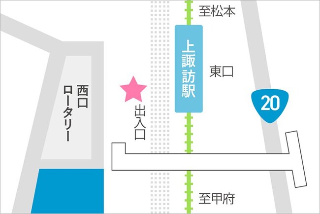 上諏訪駅西口 ※改札は東口のみですので、改札を出たら連絡通路で西口へお越しください。