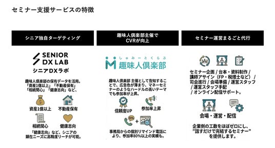本サービスは、国内最大級のシニアSNS「趣味人倶楽部(会員数42万人)」と、シニア研究機関「シニアDXラボ」で蓄積したシニアデータを活用し、セミナー企画・資料作成・講師アサイン・集客・司会・会場手配・運営までをワンストップで提供するものです。保険・相続・終活領域を中心に、既に多数の企業様にご利用いただいています。
