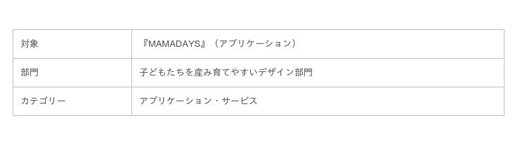 株式会社エブリー(本社所在地:東京都港区、代表取締役:吉田 大成)が運営するファミリー向け動画メディア『MAMADAYS』のアプリは、第15回キッズデザイン賞(主催:キッズデザイン協議会、後援:経済産業省、内閣府、消費者庁)を受賞したことをお知らせいたします。