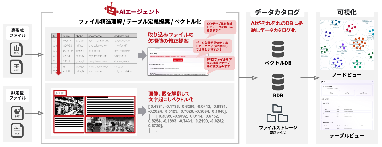 表形式ファイル(Excel、CSV)では構造を理解しテーブル定義を決定、情報に欠損値があった場合、修正提案を行った上で自律的にデータを修正しデータカタログへ登録します。また、非定型ファイル(PowerPoint、PDF)は、画像や図を文字に起こし、ベクトルおよびテーブル化した上で同じくデータカタログに登録し、データ基盤が構築されます。