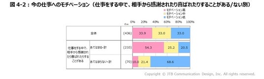 また、「今の仕事に、私の知識や能力、経験が活かせている」または「仕事をする中で、相手から感謝されたり喜ばれたりすることがある」と回答した層のモチベーションは、あてはまらない層に比べて高く、自身のスキルが活かせることや、周囲からの感謝がモチベーションに関係する可能性が示されています(図4-2)。
