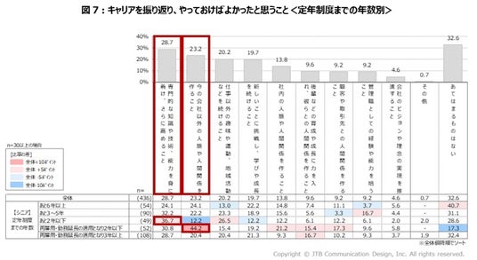 「もっとやっておけばよかったと思うこと」を3つまでの複数選択で聞いたところ、最も回答が高かったものは、「専門的な知識・能力を身につけ、さらに高めること」で28.7%でした。次いで、「今の会社以外の人脈や人間関係を作ること」の回答が多くなっています。定年制度までの年数で見ると、定年が迫るほど、「専門的な知識・能力を身につけ、さらに高めること」の回答が増加し、定年後は「今の会社以外の人脈や人間関係を作ること」の回答が多くなる傾向があります(図7)。定年を境に、後悔の内容も変化することが見てとれます。