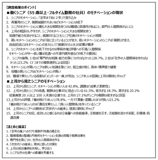 本調査は、シニア本人を対象とした調査とシニアを部下に持つ管理職を対象とした調査の2つで構成されます。それぞれの結果を「働くシニアのモチベーションの現状」および「上司からみたシニアのモチベーション」として提示します。