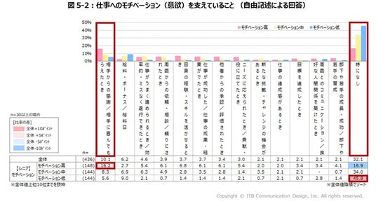 「仕事へのモチベーション(意欲)を支えていること」について自由記述で回答を求め、集計した結果、「相手から感謝される/相手に喜んでもらえたとき」が最も大きな割合を占めました(図5-2)。特に、モチベーションが高い層でこの回答の割合が高くなっています。 モチベーションが低い層では、「給料・ボーナス/給料日」が他層と比べて高い一方で、「特になし」が45.8%と突出して高い結果となりました。この結果は、モチベーションが低い層の半数近くが、仕事へのモチベーションを支えるものを見いだせていない現状を示しています。