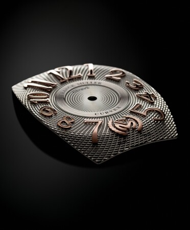 全方向に曲面するギョウシエ文字盤の上には立体的なビザン数字のアプライドインデックスが配されています。それぞれのインデックスは、ダイアルの異なる曲面の角度にあわせ、ひとつひとつ曲げられ、手作業によって植字されています。