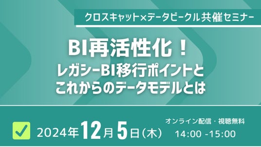 DX支援サービス「CC-Dash」を提供する株式会社クロスキャット(本社:東京都港区、代表取締役社長:山根光則、以下クロスキャット)は、株式会社データビークル(本社:東京都港区、代表取締役社長:油野達也、以下データビークル)と、共催セミナー「BI再活性化!レガシーBI移行ポイントとこれからのデータモデルとは」を2024年12月5日(木)14時から開催いたします。