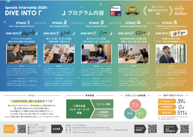 オリジナルグッズを製作するアイグッズ株式会社(本社:東京都渋谷区)は、2024年度卒業見込み学生に向けたインターンシップ『DIVE INTO「 」』の実施を開始いたしました。当社のインターンシップは従業員数50名の規模でありながら、2023年度のエントリー総数は約7700名(入社倍率700倍)、さらに株式会社ワンキャリア主催の就活クチコミアワード2022ではベンチャー部門GOLD賞、インターン部門BRONZE賞を受賞し、多くの学生に注目をいただいています。今年度はさらに実施コンテンツに磨きをかけ、「働く本質」を得られる体感型プログラムを企画開発しました。