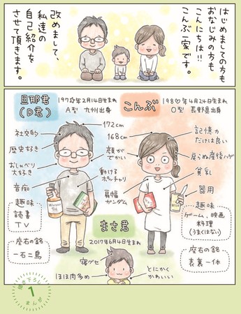 長野県に住むこんぶ一家。感情が豊かな「こんぶ」さんと、いつも穏やかで優しい「D君」夫妻、そして2017年生まれの「まさ君」の3人家族です。