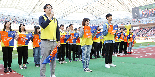 サンクスデー当日に試合会場でボランティア業務を体験する亀田製菓の新入社員の皆さんが、ご来場の皆様に応援メッセージをお伝えします。ぜひ、メッセージをお聞きいただき、キックオフ直前のスタジアムを熱く盛り上げてください。
