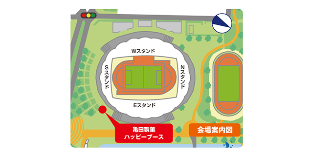笑顔あふれる”ハッピー”なスタジアムでサポーターの皆様を迎えたいという亀田製菓の願いから、今年もオリジナルグッズやお菓子のプレゼントを実施。Eゲート前広場には『ハッピーブース』が展開されます。
